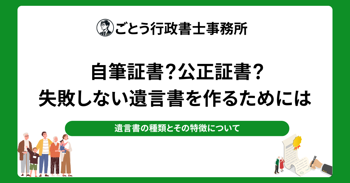 こんにちは!ごとう行政書士事務所の後藤です。前回のコラムでは、遺言書の意義や作成のタイミングについてお話ししました。今回は、遺言書の種類とその特徴について詳しくお話ししていきます。遺言書にはいくつかの方式があり、それぞれにメリットとデメリットがあります。ご自身の状況や考え方に沿った、最適な方式を選ぶための参考になれば幸いです。