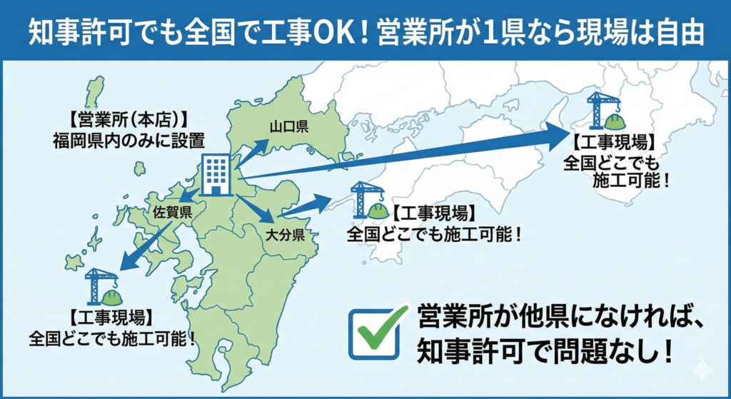 ※現場が他県にあっても、営業所が福岡県内だけであれば「知事許可」で全国どこでも施工可能です 。