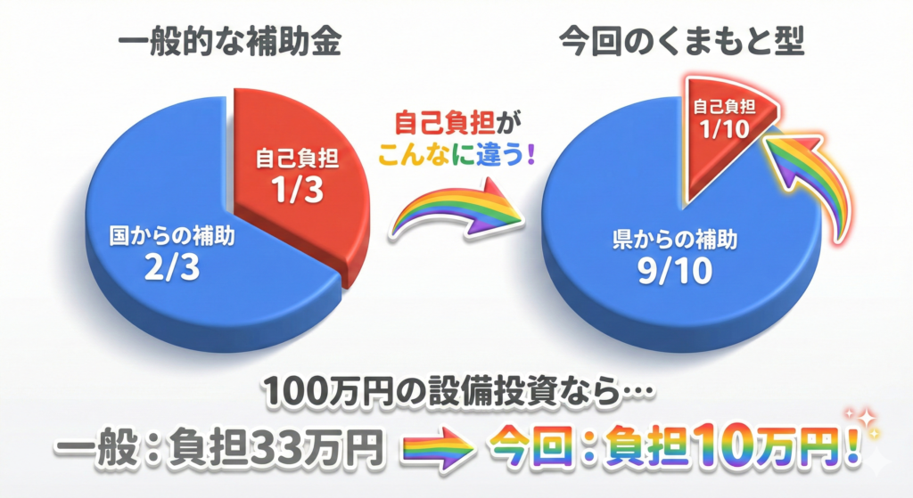 通常、こうした補助金の補助率は、小規模事業者持続化補助金の「2/3(約66%)」やものづくり補助金等の「1/2(50%)」が一般的です。しかし、今回のくまもと型応援補助金は、なんと「9/10(90%)」もあるんです。
