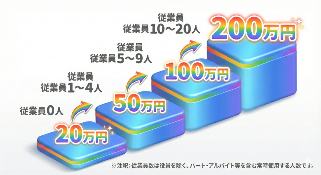 今回の補助金は、従業員の数に応じて「4段階」の上限額が設定されています 。 従業員数が多いほど、使える金額が大きくなる仕組みです。
